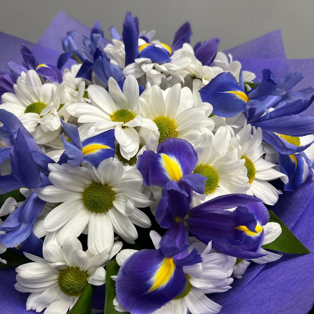 Букет из синих ирисов и белых кустовых хризантем напоминает летнее поле. Прекрасно подойдет для поздравления с Днем рождения, юбилеем или свадьбой.